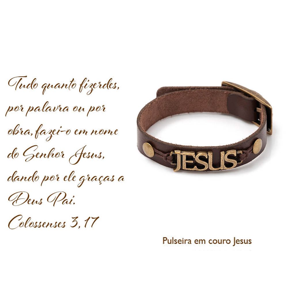 Pulseira Em Couro Jesus, produzida com amor. Uma homenagem à aquele que foi o maior Homem do mundo, nosso Senhor Jesus Cristo. Com materiais de qualidade e 100% brasileira, a Pulseira Em Couro Jesus traz a jovialidade e estilo. Expresse sua fé.