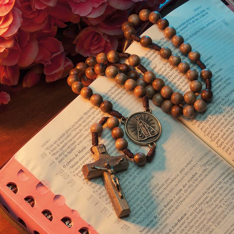 Terço de Nossa Senhora Aparecida, confeccionado em cordão marrom, contas em imbuia com 1,9cm, metais em ouro velho.