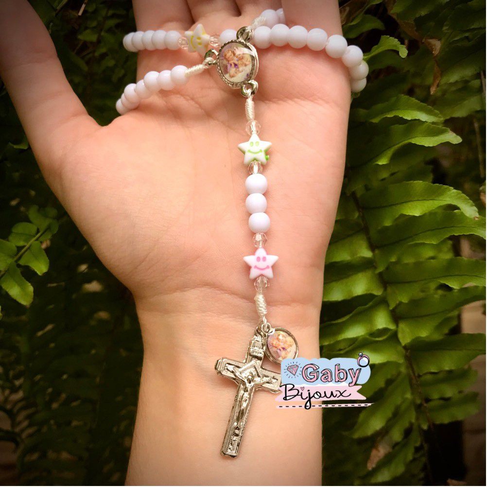 Terço com contas em pérola metalizada na cor branca, entremeio de resina Anjinho da Guarda, medalha de metal prata com imagem em resina colorida do Anjo da Guarda, estrelinhas coloridas, crucifixo de metal e barbante na cor branca.